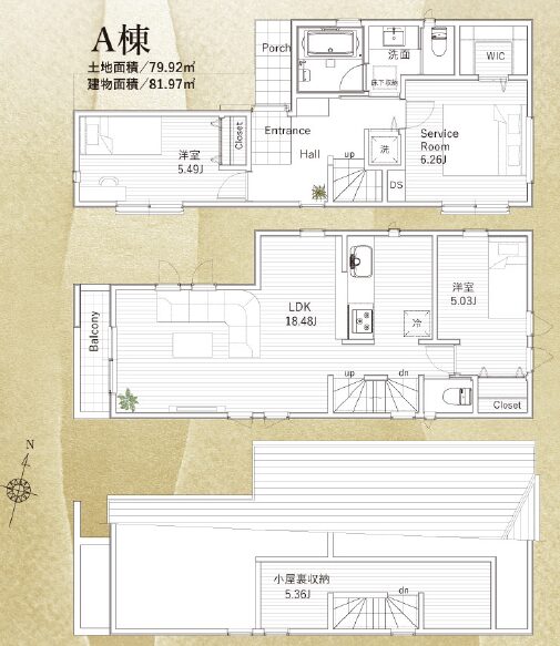 | 間取り | 2LDK+S+WIC ≪LDK18.48帖、6.26帖、5.49帖、5.36帖、5.03帖≫ |