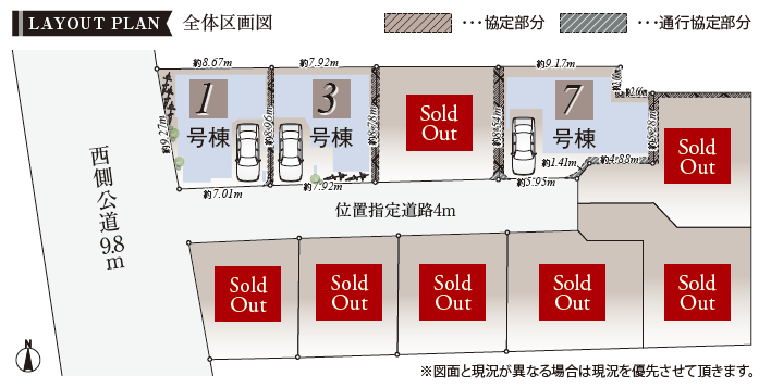| 接道・方位 | 西側道路約9.8m・位置指定道路4.0m | 現況 | 完成済 |