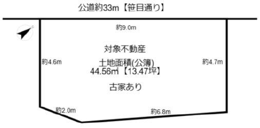 | 接道・方位 | 北西側33m公道 | 現況 | 未完成 |